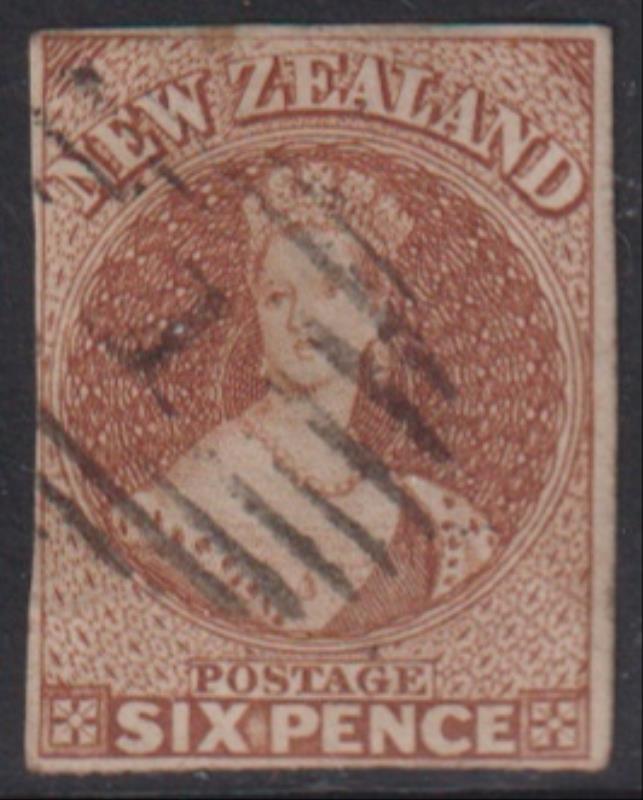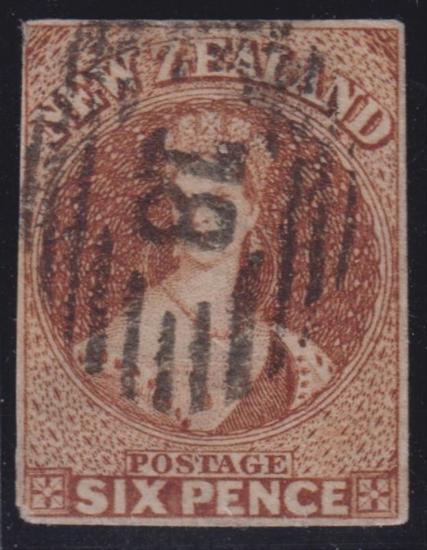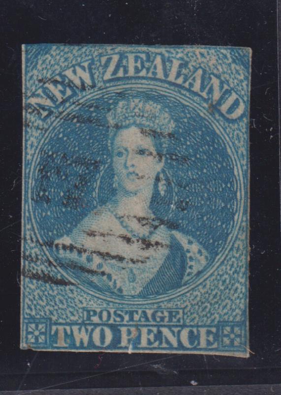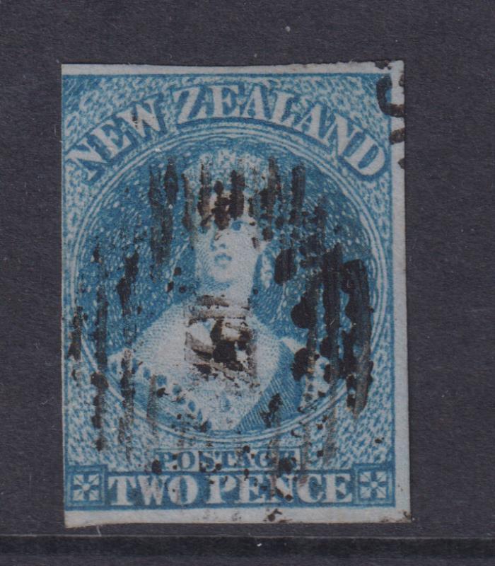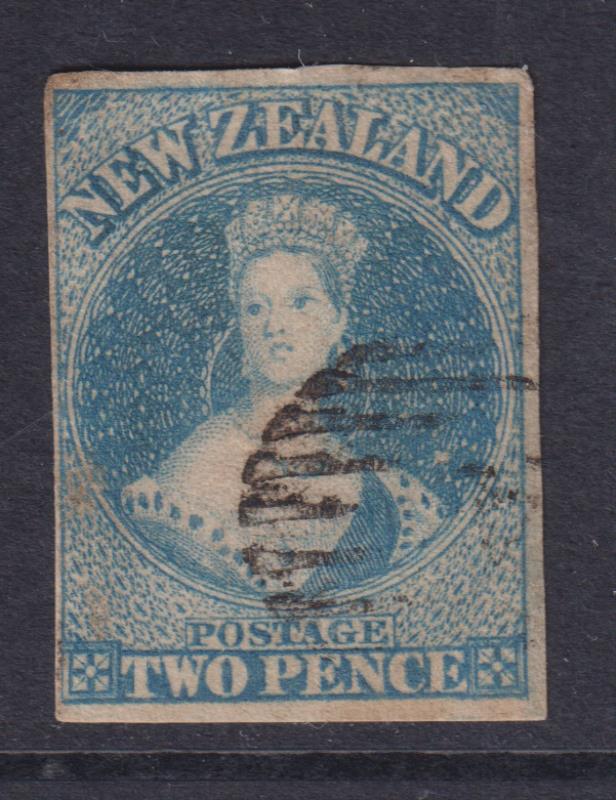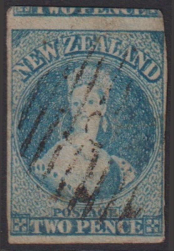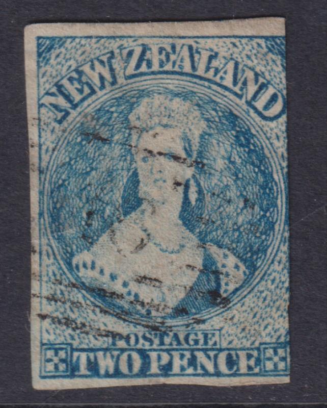 FFQ Chalon 2d blue imperf nearly 4 margins, close all round, no wmk. Minor faults, barred "17" pmk (Christchurch). SG 10.