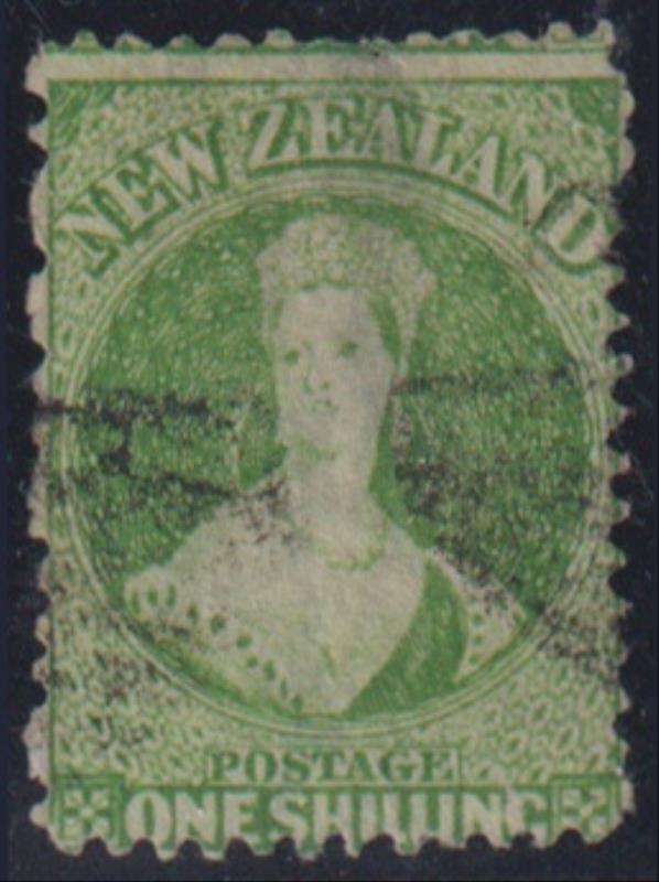FFQ Chalon 1/- yellow-green, p12½, star wmk, large back thins. SG 125. Cat £160. GU nearly FU. (Image)