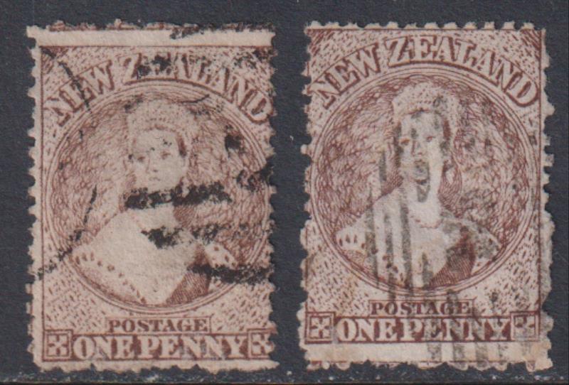 FFQ Chalon 1d brown, p12½, star wmk, worn plate. Two contrasting examples: a) very thick paper; b) thin paper. SG 132a. Cat