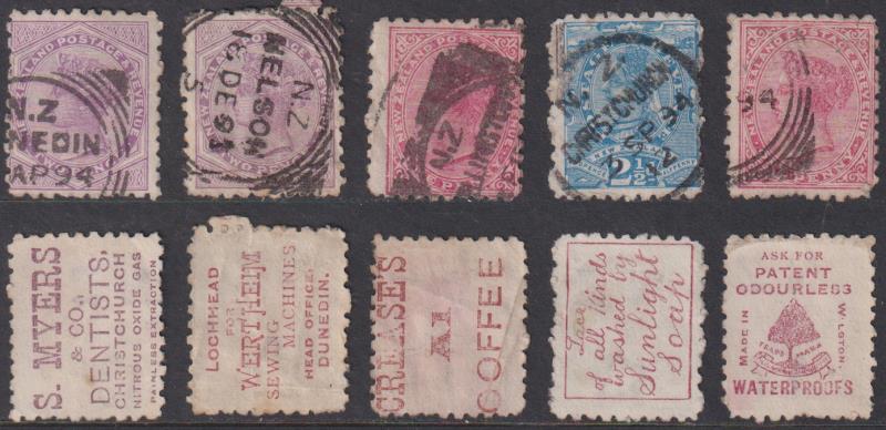 1893 SSF seln of 5 advts: 1d Crease's Coffee & Odourless Waterproofs; 2d Wertheim Sewing Machines & S Myers Dentists; 2½d