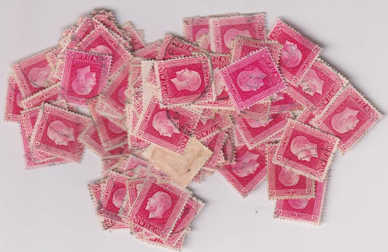 1915-26 GV seln: 4d violet x 12, 5d blue x 6, 6d red x 24, 8d brown x 4, 9d green x 8, 3d brown recess x 11, 1/- orange x 7, 2/- Admiral (parcel cancels) x 7. Mixed cond. Jury cat $250+. GU/FU.