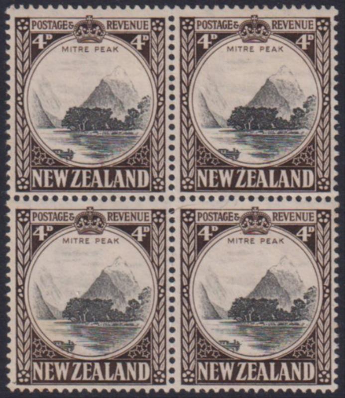 1936 4d Mitre Peak block of 4, p14 x 13½, mult invt wmk. Cat $200. MNG. (Image)