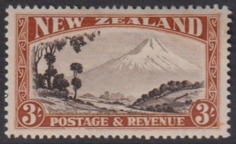 1936 3/- Mt Egmont, p14-13 x 13½, horiz mesh. CP L14d. Cat $50. Mint. (Image)