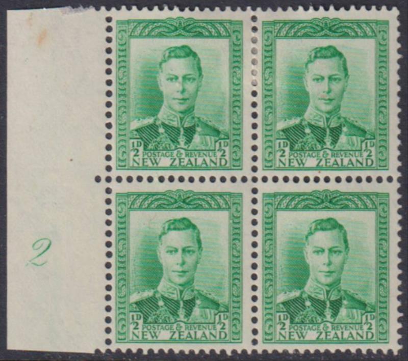 1938 ½d GVI green plate block of 4, plate 2. CP M1a. Cat $60. 2 mint/2 MUH. (Image)