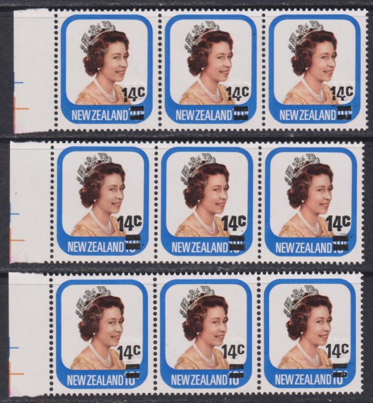 1979 14c on 10c QEII, 3 matching horiz strips of 3 with colour registers: a) very heavy surcharge; b) double surcharge 1