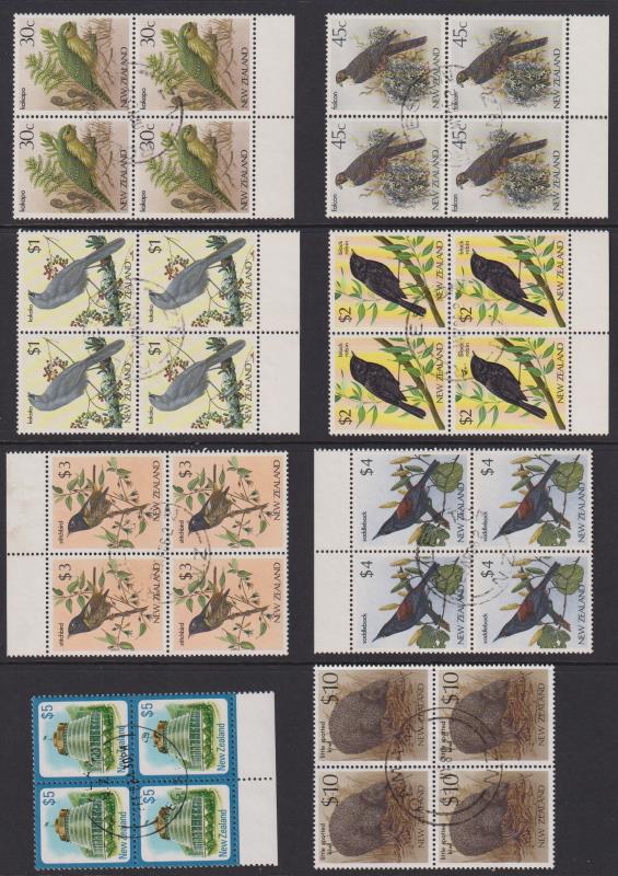 1985 30c, 45c, $1-$4 & $10 Birds & $5 Beehive in blocks of 4. VFU. (Image)