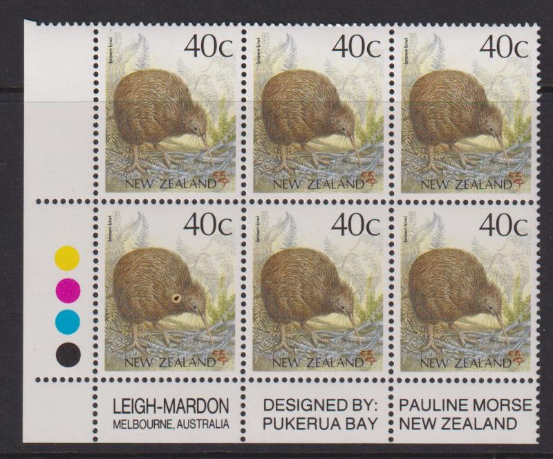1988 40c brown Kiwi, R10/1 neck flaw in plate block of 6. CP cat $60. MUH. (Image)