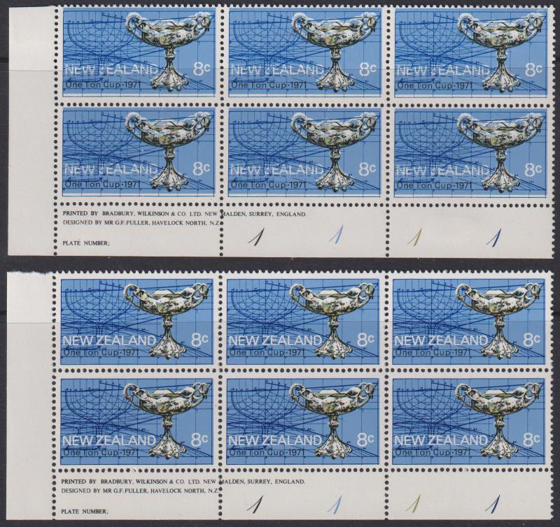 1971 8c One Ton Cup Plate block of 6 - No 1111. Light blue moved nearly 2mm upwards, remaining colours nearly 1mm. Gives