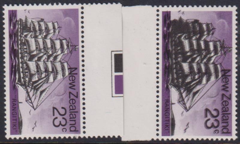 1975 23c "Rangitiki" Sailing Ship error: double black resulting in a very "heavy" looking vessel, with normal for comparison.