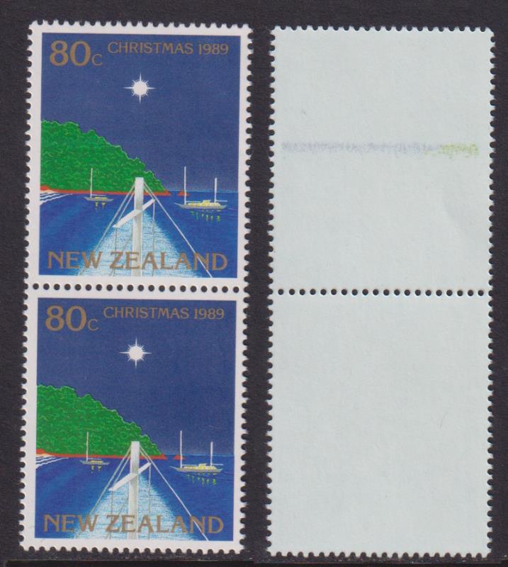 1989 80c Christmas partial offset of green & blue, about 1mm deep, MUH + normal for comparison. (Image)