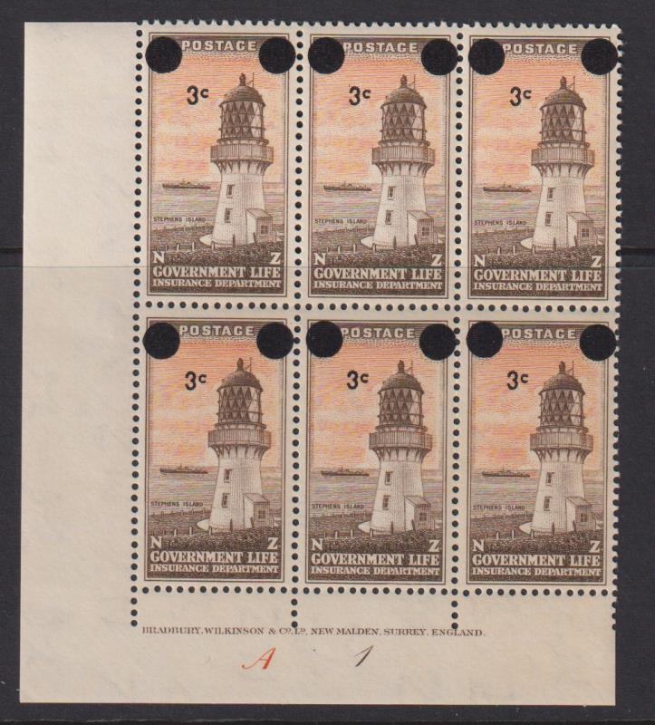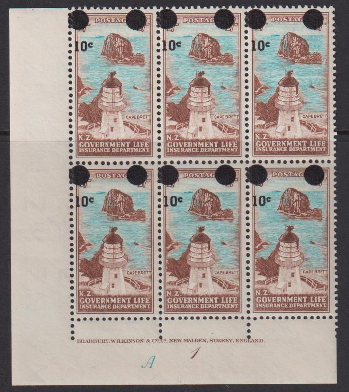 1967 10c on 1/- Cape Brett plate block of 6, cream paper. CP cat $60. MUH. (Image)