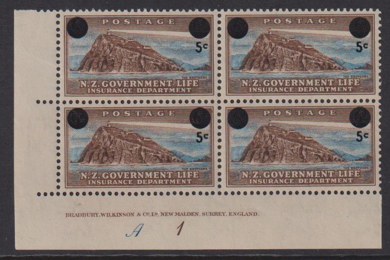 1967 1c on 1d Taiaroa plate block of 4, white paper. CP cat $80. MUH. (Image)