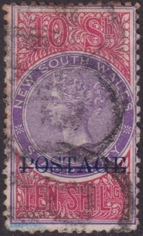 1998 U imageNSW 1885-6 10/- QVLT mauve & claret, p12 x 11 ovpt "POSTAGE". Light but smudged cdss. GU/FU. (Image)