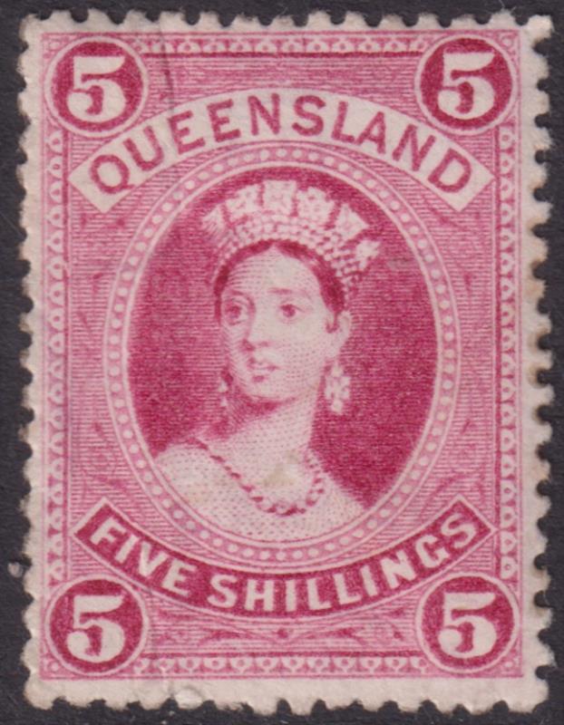 2001 M imageQueensland 1886 5/- QV full face rose, slight buckle seen from reverse. Full gum. SG 15a. cat £65. Mint. (Image)