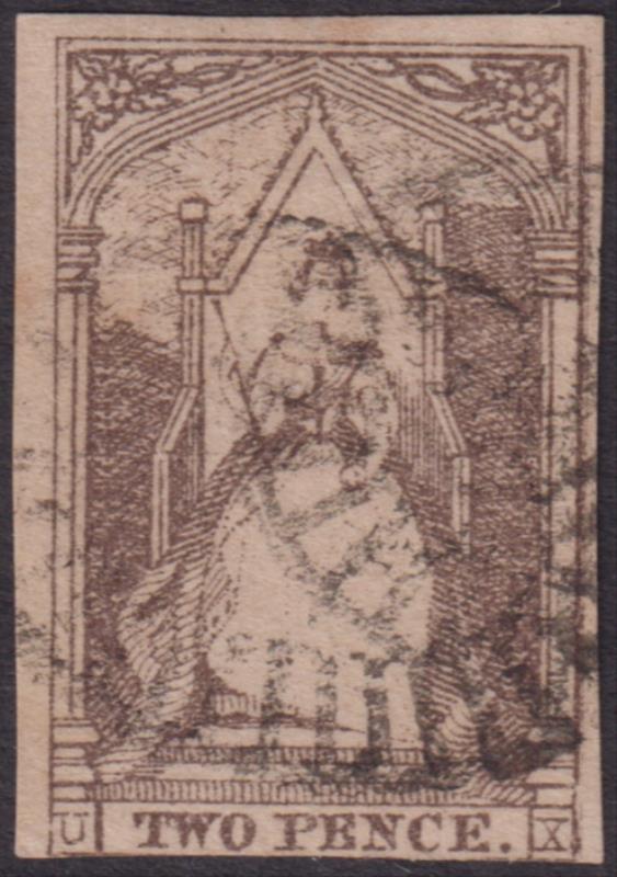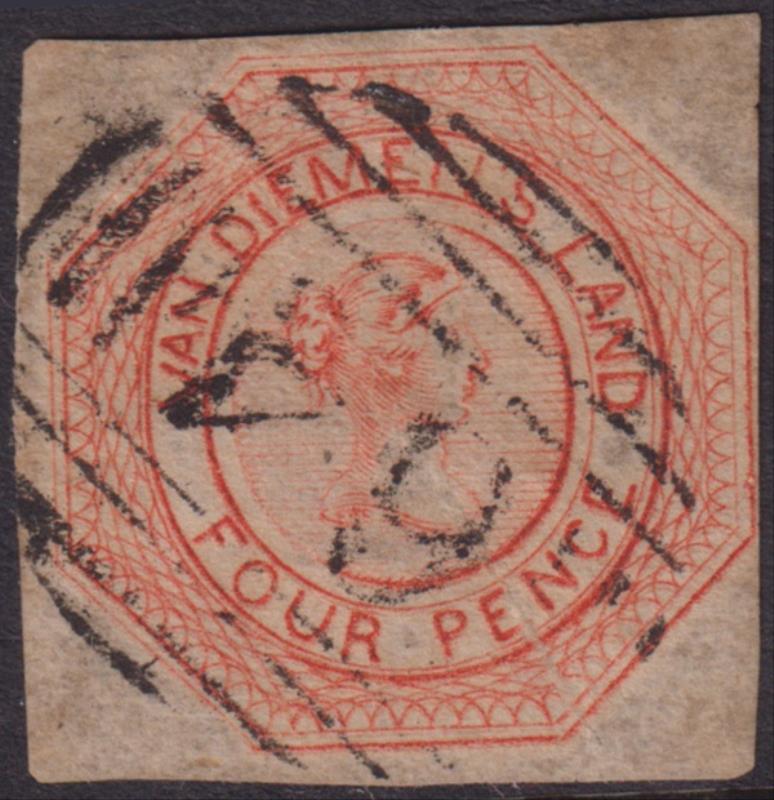 2009 U imageTasmania 1853 4d QV dull orange, imperf 4 margins, diagonal crease, neat crisp cancel. SG 11. Cat £375. FU. (Image)