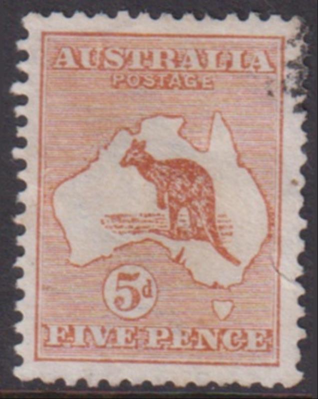 1913 5d Roo chestnut, centered low, slightly short corner, neat small "Kalgoorlie 1915" cds. SG 8. Cat £48. FU. (Image)