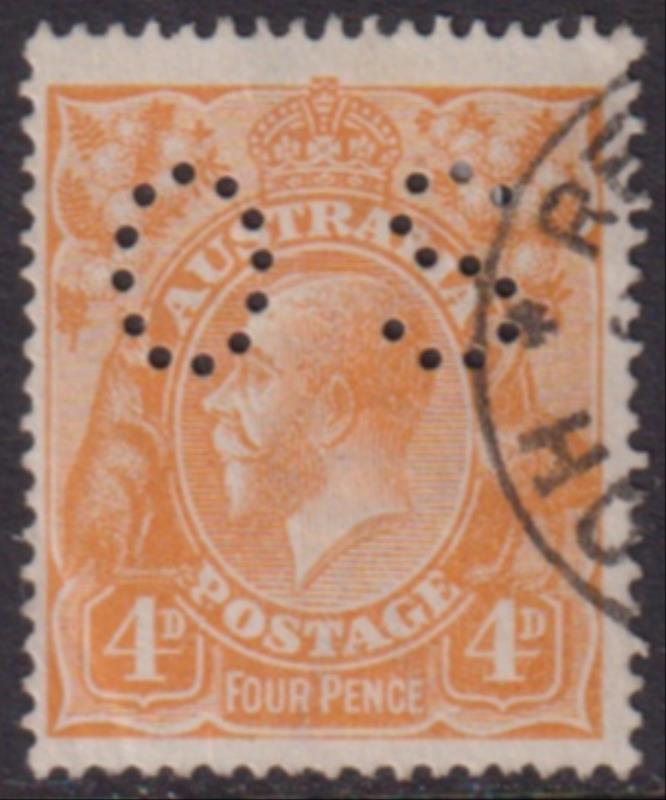 1914 4d GV pale orange-yellow, perfinned small OS, small corner crease. SG O41b. Cat £18. FU. (Image)