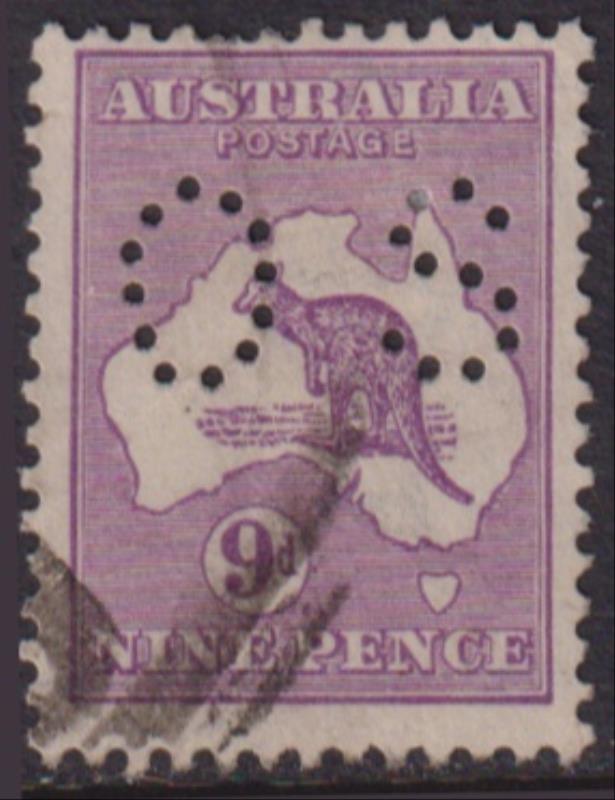1915 9d Roo, die IIB, perfinned small OS. SG O47b. Cat £42. FU. (Image)