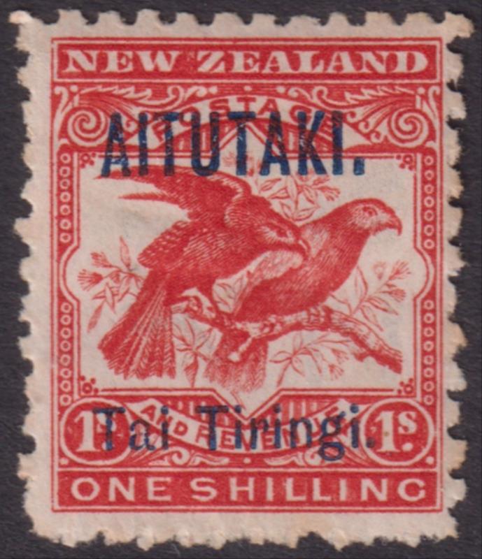Aitutaki 1903 1/- Kaka bright red, p11, with ovpt. SG 7. Cat £60. Mint. (Image)