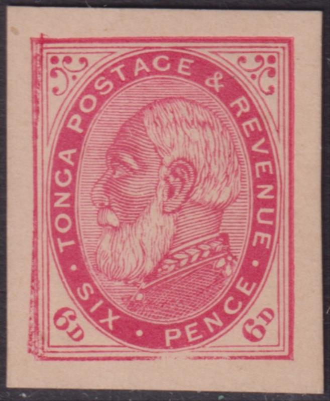 Tonga c1886 6d King George I rose, 21.5 x 26.5mm die proof on thin card. (Image)