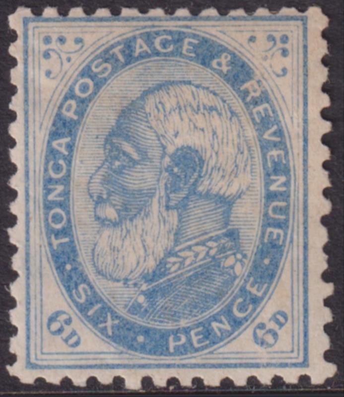 Tonga 1887 6d King George I blue, p12 x 11½, type 2 (broken "P" in "PENCE"). SG 3a. Cat £75. Mint. (Image)