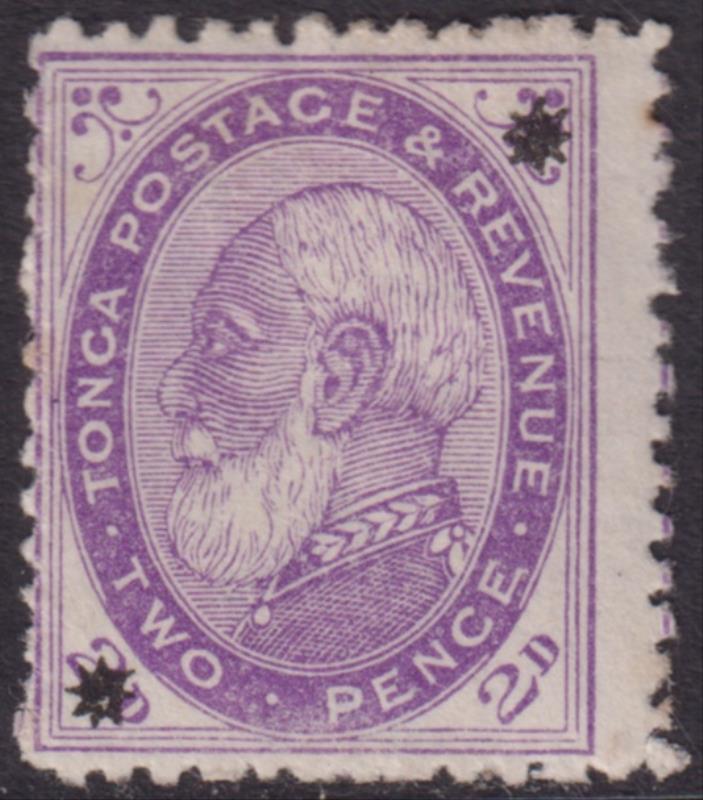 Tonga 1891 2d King George I violet, p12½, stars ovpt, type 4 (oval broken under "TW" of "TWO" & under "CE" of "PENCE"). SG 8.