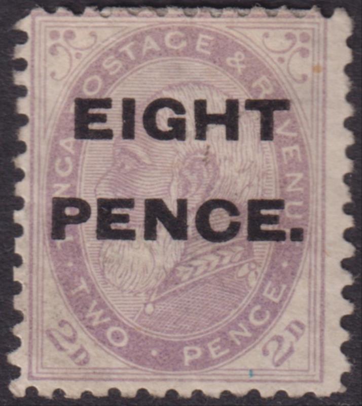 Tonga 1891 8d on 2d King George I pale violet. SG 6 var. Cat £50. Mint. (Image)