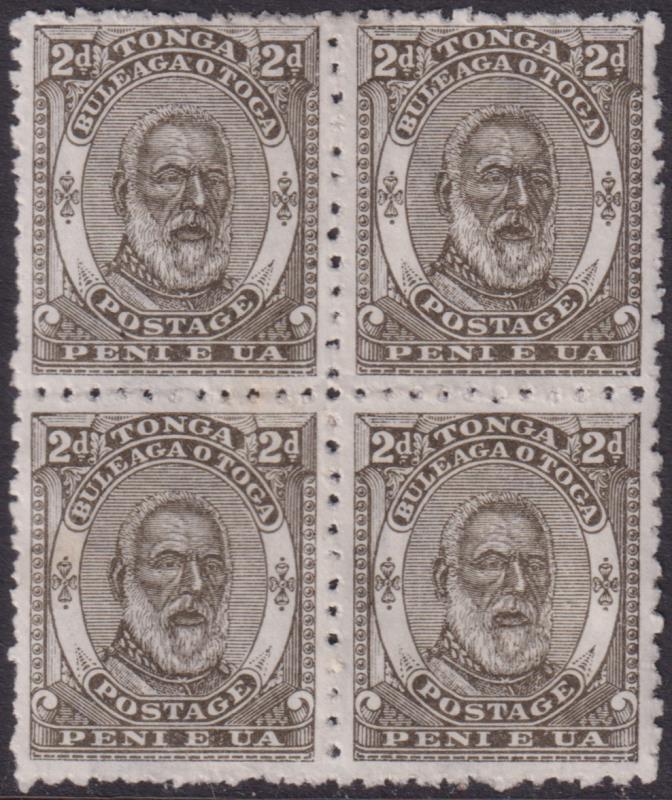 Tonga 1892 2d King George I olive block of 4, p12 x 11½, 1 with small thin at top. SG 11. Cat £180. MNG. (Image)