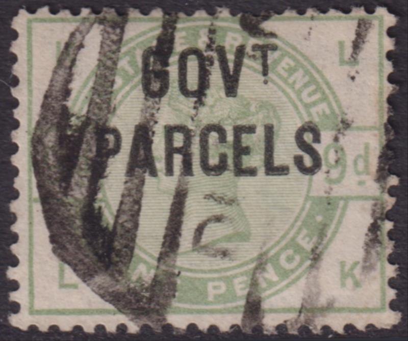 1883 9d dull green (LK), GOVT. / PARCELS. SG O63. Cat £1200. GU. (Image)