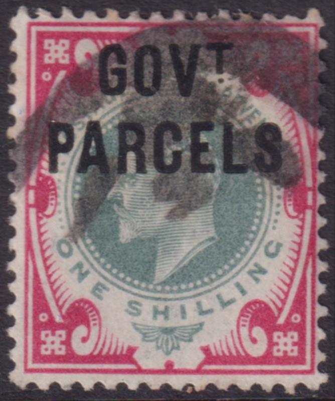 1902 1/- EVII dull green & carmine, GOVT. / PARCELS. SG O78. Cat £200. GU. (Image)