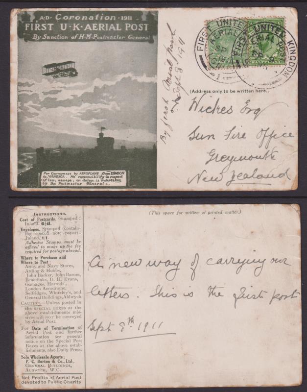 1911 Coronation London-Windsor special flight p/c in green, 9 SP special pmk x 2 tied by ½d EVII & ½d GV stamp. Addressed to