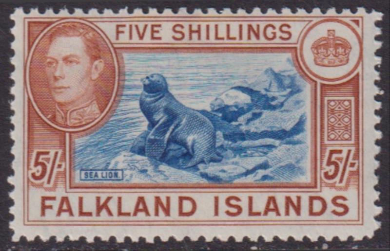 2890 M imageFalkland Isl 1938 5/- GVI Sealion blue & chestnut. SG 161. Cat £160. Mint. (Image)