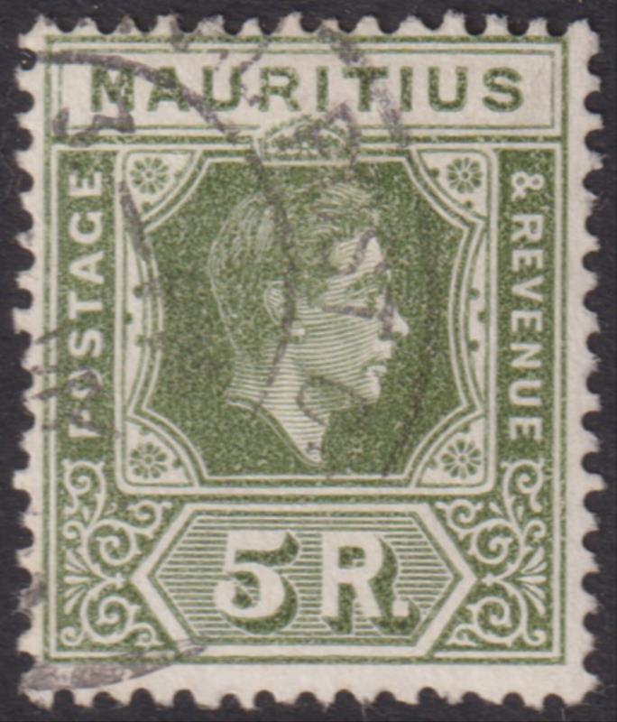 3040 U imageMauritius 1943 5R GVI sage-green, ordinary paper. SG 262a. Cat £48. FU. (Image)