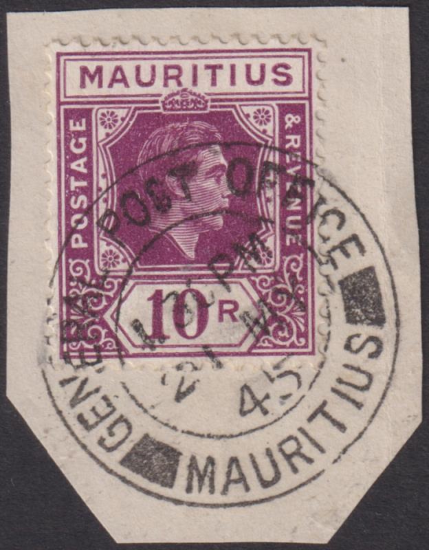 3041 U imageMauritius 1943 10R GVI reddish purple, ordinary paper, on neat piece canc fine complete "General Post Office/Mauritius" cds 21 MY 45. Top value. SG 263a. Cat £70. (Image)