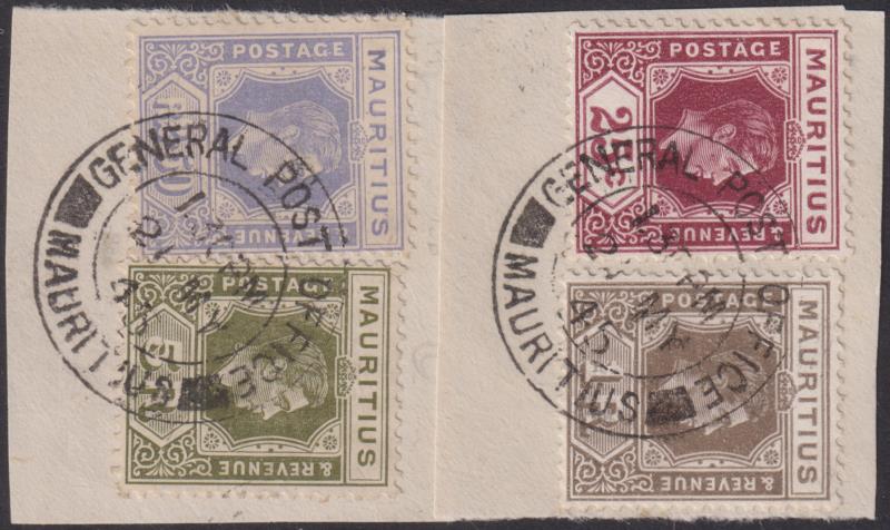 3042 U imageMauritius 1943 GVI 2R50 pale violet & 5R sage-green, both ordinary paper, on neat piece canc "General Post Office/Mauritius" cds 21 MY 45. Also similar piece with 1R & 25c (same cds & date). SG 259b, 260b, 261b, 262b. Cat £82. All FU. (Image)
