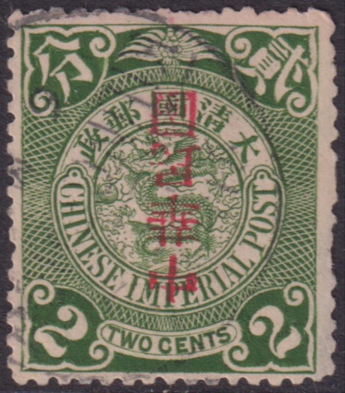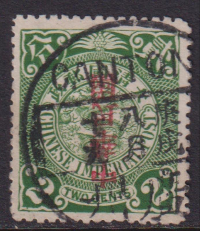3178 U imageChina 1912 (March) 2c green with ovpt in red, variety "ovpt inverted", possibly an unofficial ovpt but clearly canc by "Canton" circular d/s in black. Rare. SG 217a. Cat £3750. (Image)