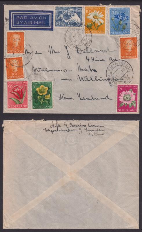 3441 C imageNetherlands 1952 Airmail cover to NZ bearing 1952 Summer stamps set & 4 additional adhesives. SG 749-53. Cat £20+. (Image)