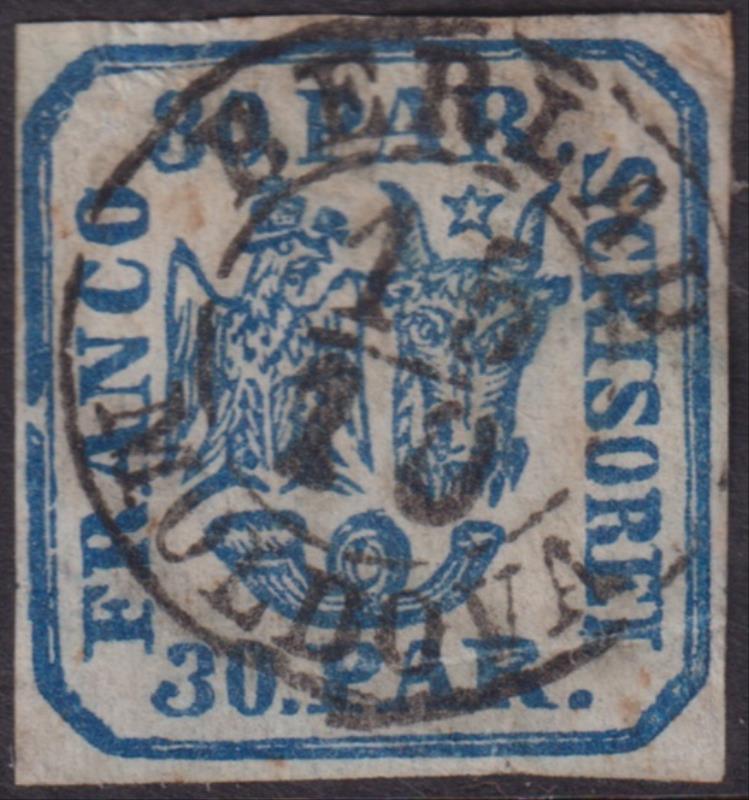 3458 U imageRomania 1862 30p deep blue, imperf 4 margins, wove paper, crisp central cds. SG 31a. Cat c£140. FU. (Image)