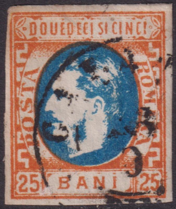 3459 U imageRomania 1869 25b Prince Carol blue & orange, without beard, imperf 4 margins. SG 77c. Cat £31. FU. (Image)