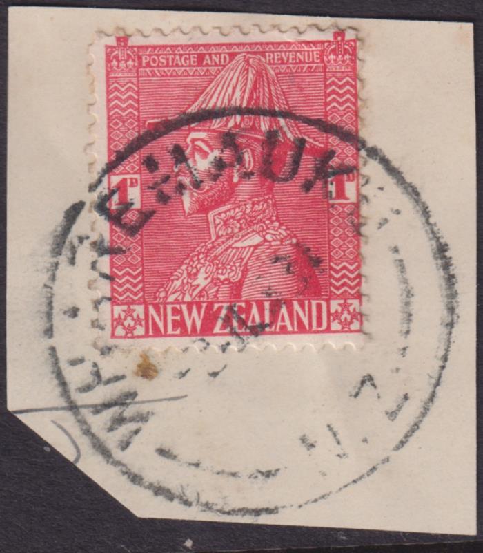 585 U imageWharemauku (WN 1929-34) good 8 July 1933 "J" class cancel on 1d Field Marshal on piece. Wooders 7. (Image)