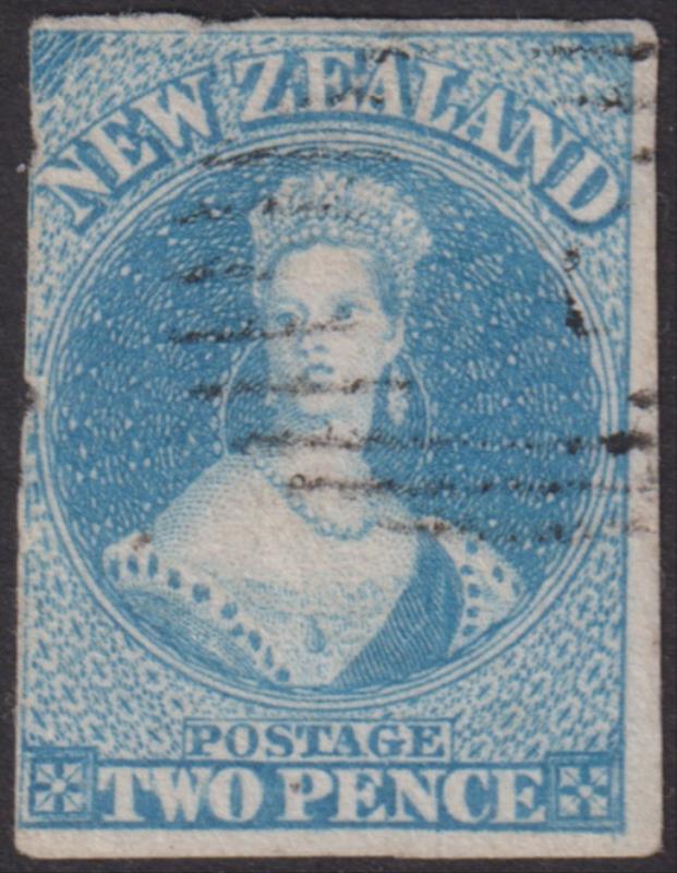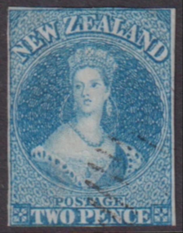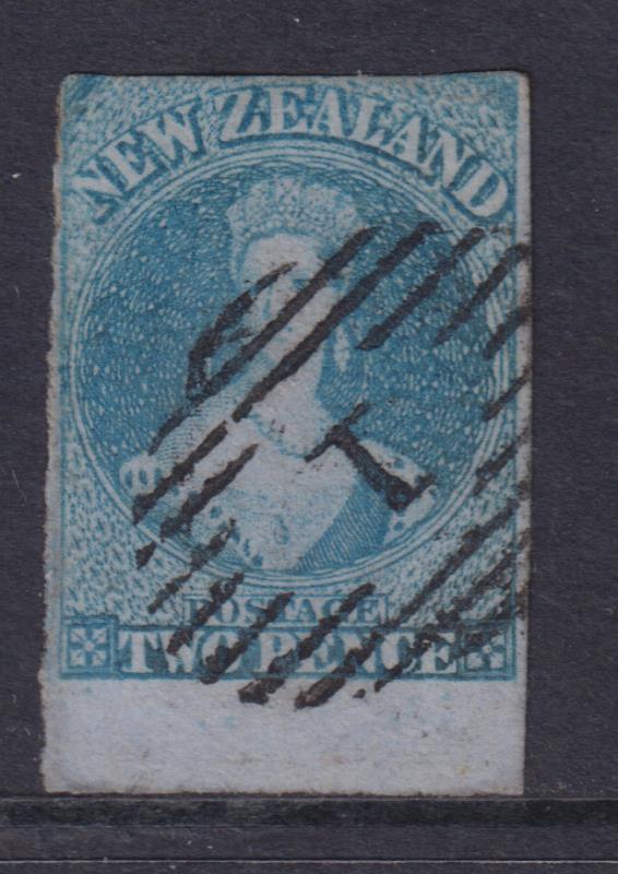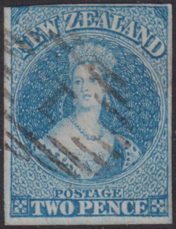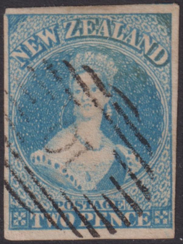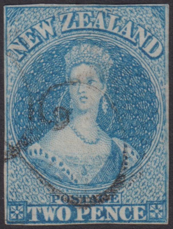 FFQ Chalon Chalon 2d blue on blue paper, no wmk, 3 margins incl large lower sheet selvedge, superb #1 (Auckland) obliterator.