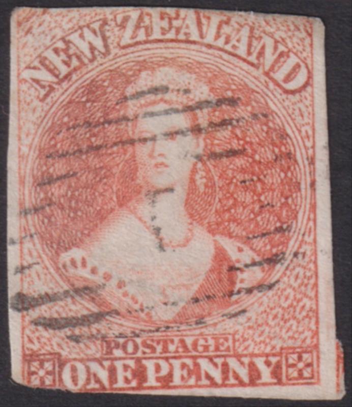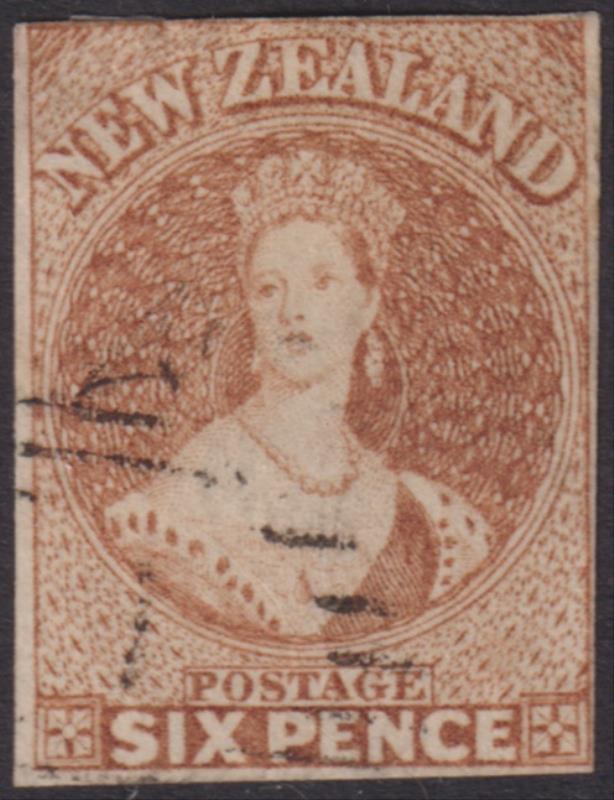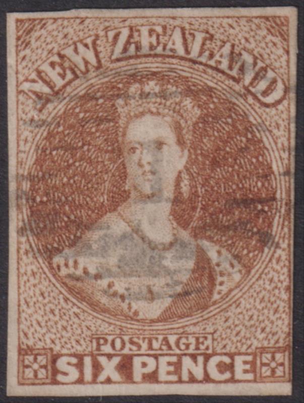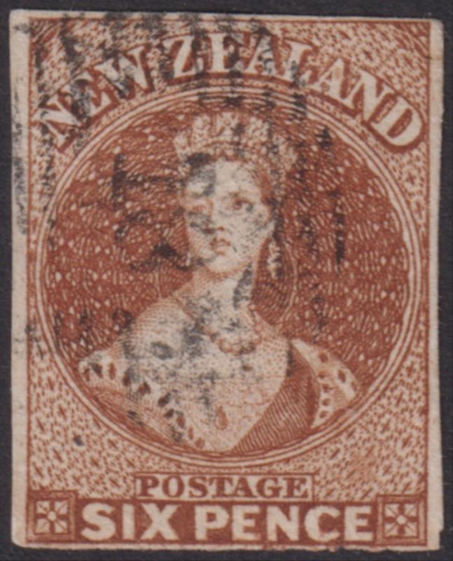 FFQ Chalon 6d brown, imperf 4 margins (close), no wmk. Fine barred "7" cancel (Wellington), light back thin. SG 13. Cat