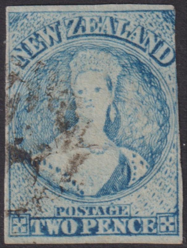 FFQ Chalon 2d pale blue (worn plate), imperf 3 margins 4th close, NZ wmk, cancel light & smudged. SG 98. Cat £350. GU/FU. (Image)