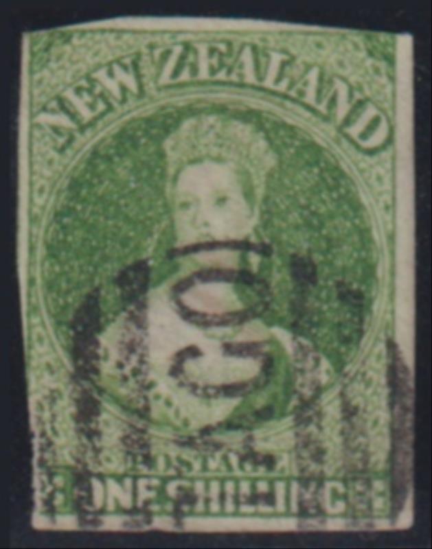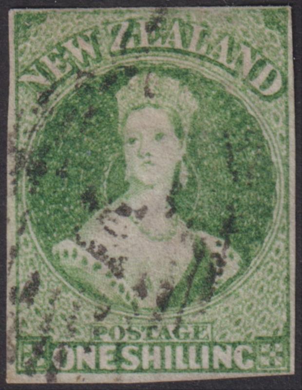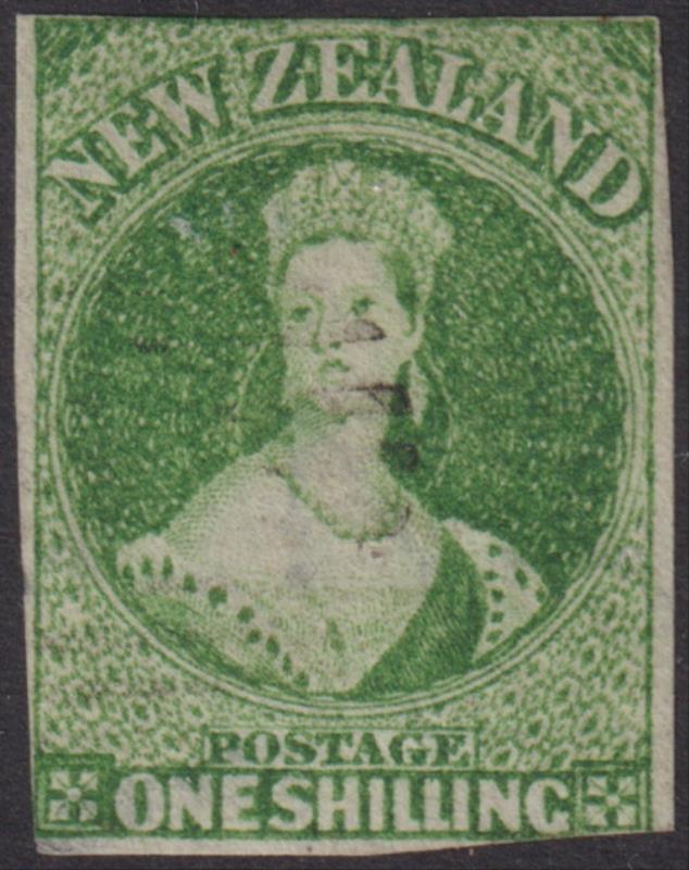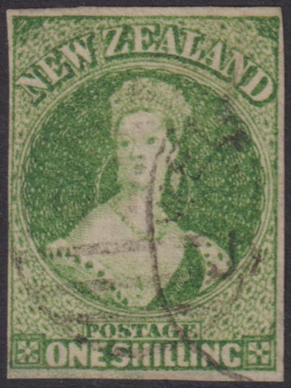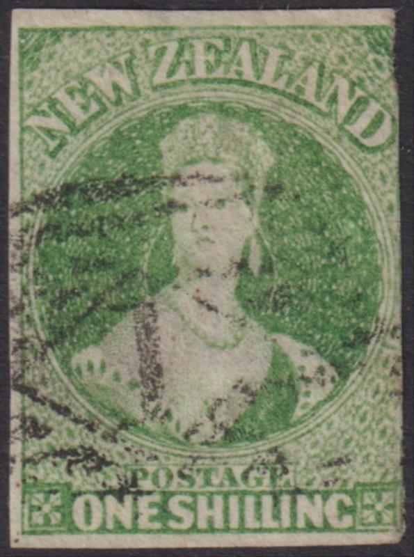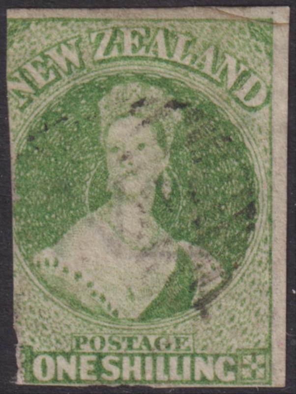 FFQ Chalon 1/- green, imperf 4 margins, NZ wmk, cds touches face. SG 100. Cat £475. FU. (Image)