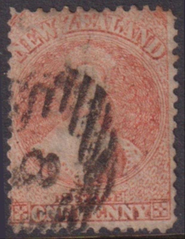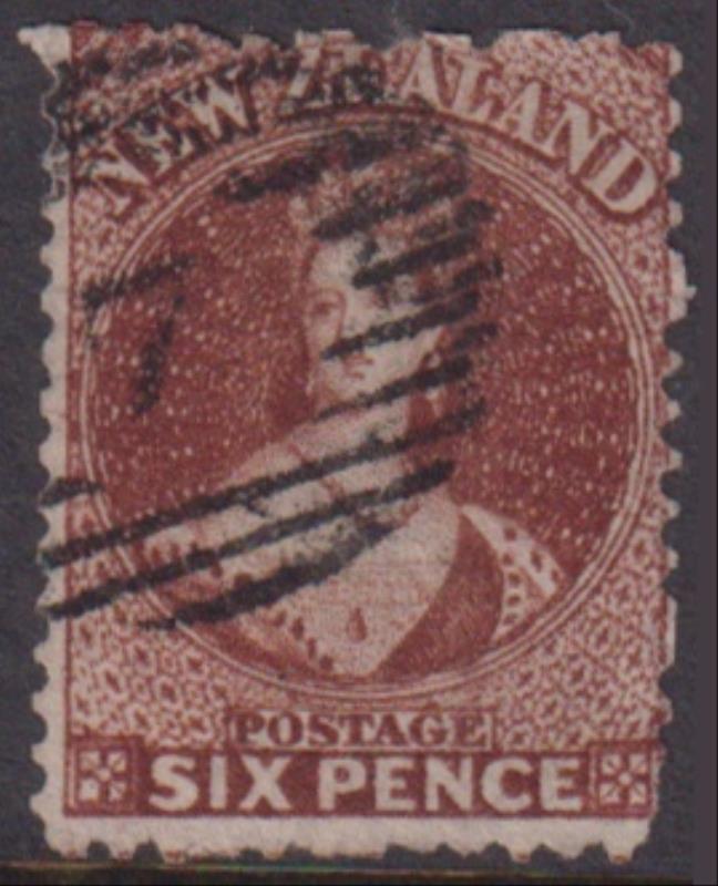 FFQ Chalon 6d red-brown, p12½, NZ wmk, heavyish barred cancel. SG 108. Cat £65. GU. (Image)
