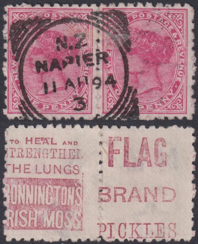 1893 1d SSF p10 vert pair, advts Bonnington's & Late, 2nd setting in red-brown (positions 167 & 179), TE NUI 17 AP 94 "A" class