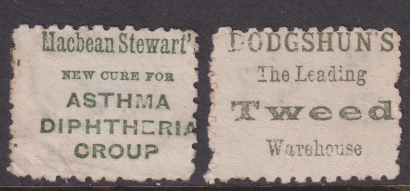 1893 2d SSF p10 green advts x 2: Dodgshun's & Macbean Stewarts. CP cat $80. GU/FU. (Image)