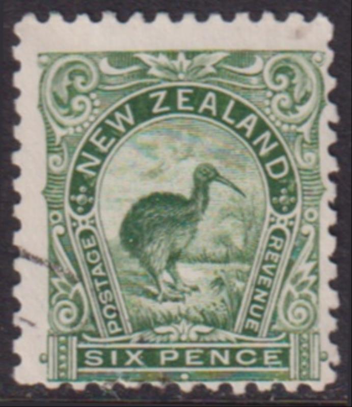 1899 6d Kiwi deep green, p11, no wmk, o/c. CP E14b(1). Cat $100. FU. (Image)