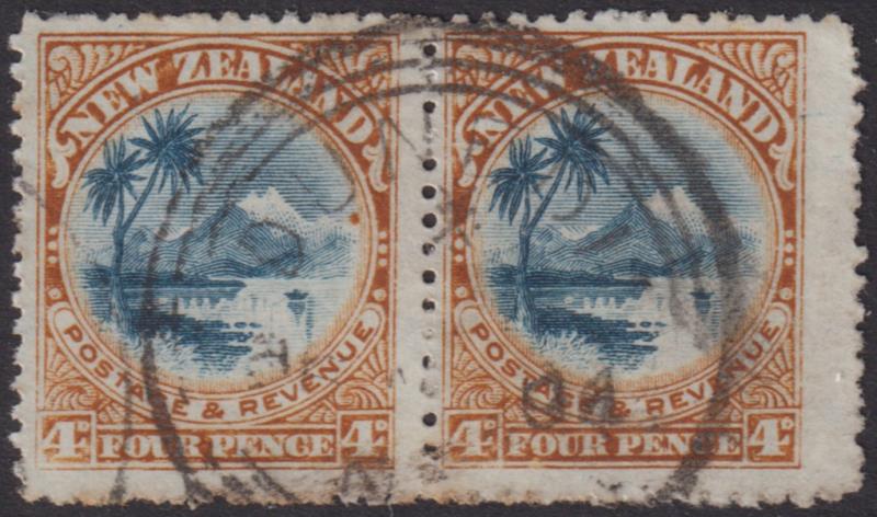 1903 4d Taupo blue & yellow-brown horiz pair, p14, NZ & star wmk, variety reversed wmk. Rare multiple. CP E12c(W). Cat $750.