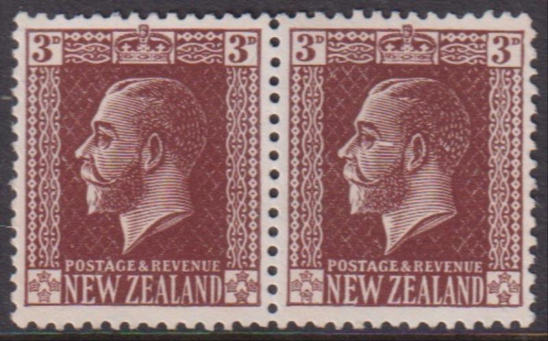 1915 3d GV brown surface horiz pair, p14, Cowan, RH stamp "flaw on face" (R6/8). CP K19d(z). Cat $330. MNG. (Image)